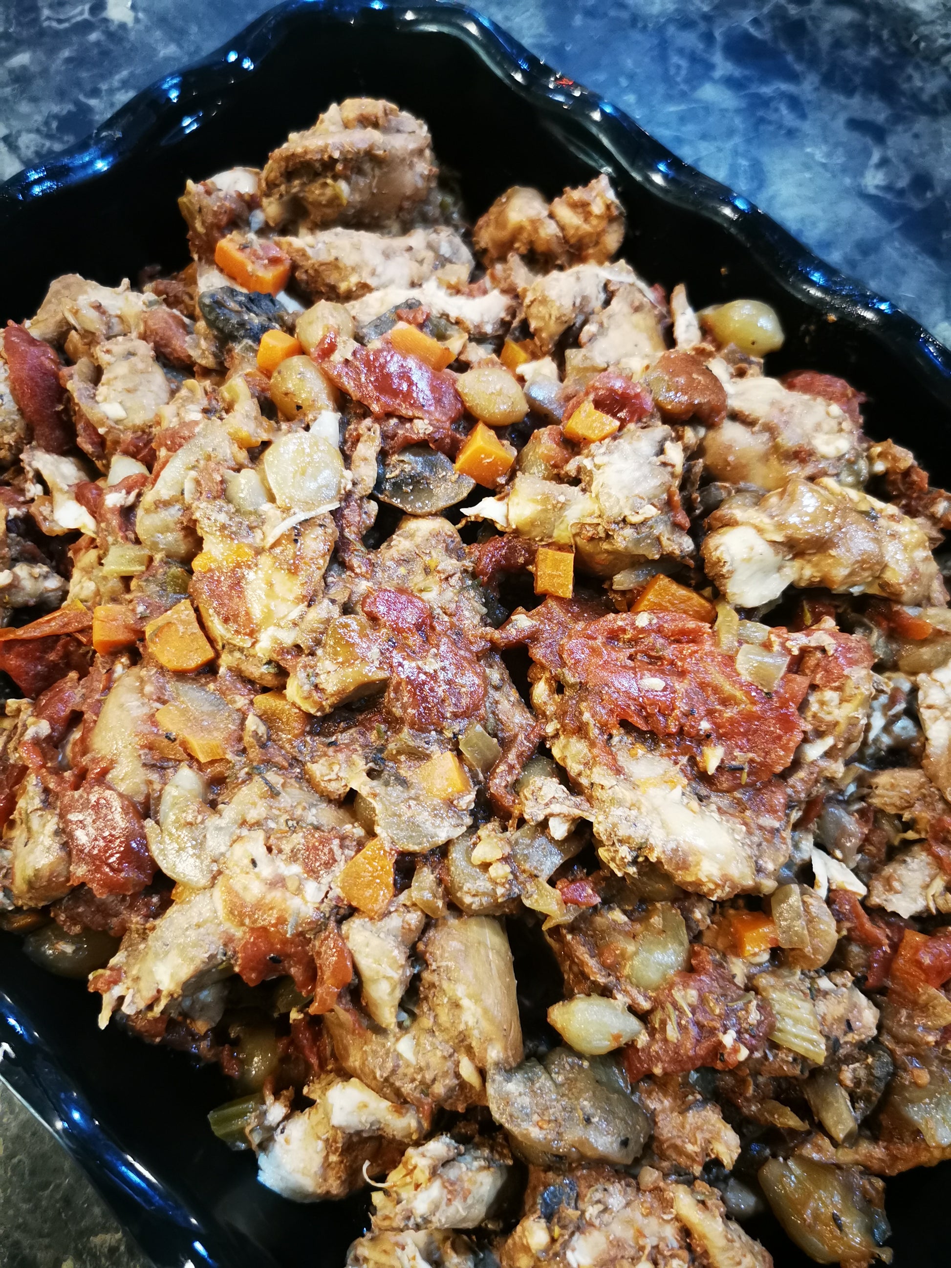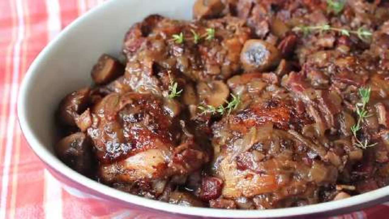 Boneless chicken thighs casseroled with mushrooms, onions & tomatoes in a Red Wine Sauce